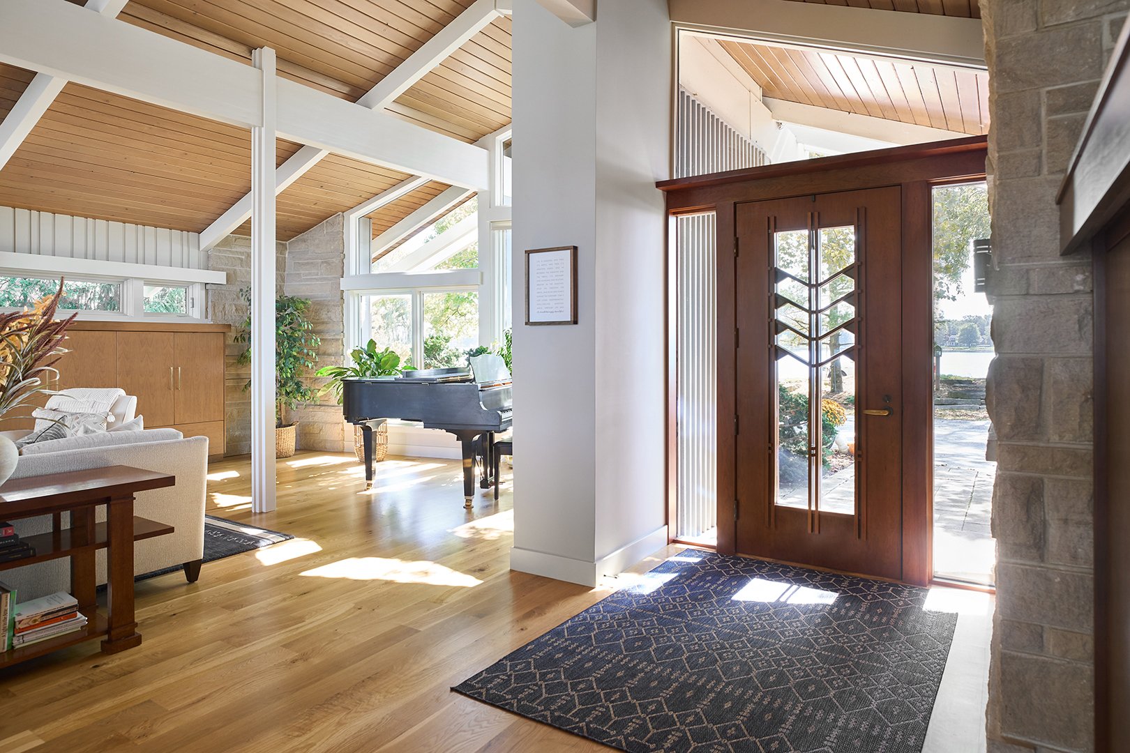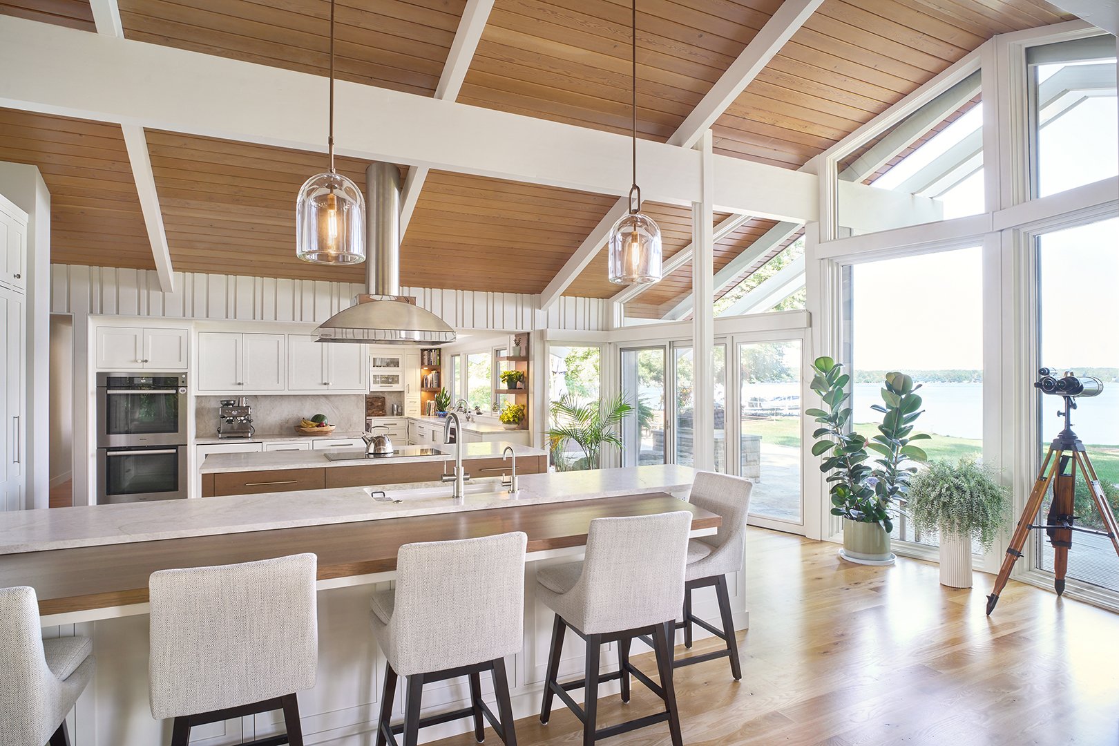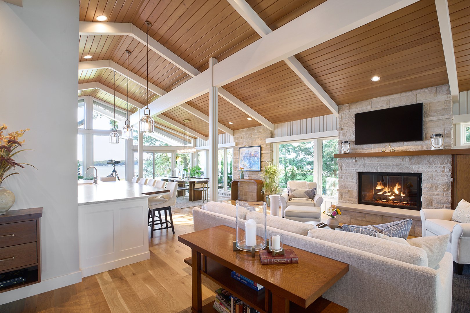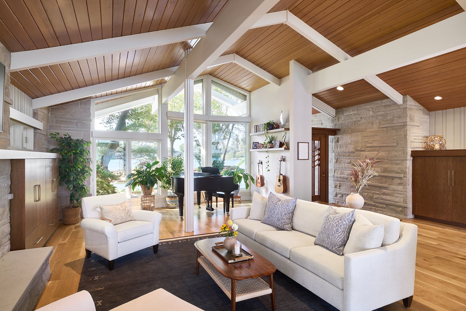 Our team brought new life to this exceptional Mid-Century Modern gem, remodeling it into a warm, welcoming home for a growing family. This was incredibly challenging project as it included adding a second floor and taking many rooms down to the studs, updating plumbing, electrical, and more. From the dream living room to the beautiful kitchen with a landscape lake view, this home melds legacy and old craftsmanship with new beginnings.
